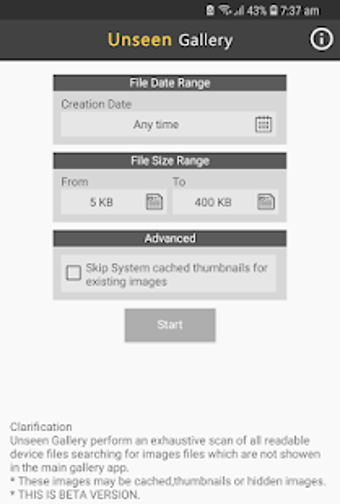 While it doesn’t retrieve videos, Unseen Gallery Cached images is still a solid choice for restoring or deleting images. It also allows you to assign a date and file size as well as enable scanning for WEBP and PNG files for more narrowed search results.